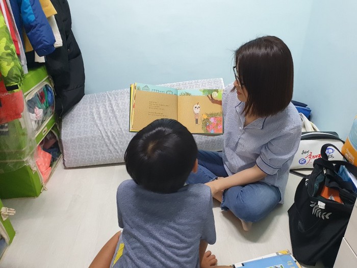 [사진설명] 독서활동가가 소외계층 아동 가정을 방문해 독서활동을 진행하고 있다.