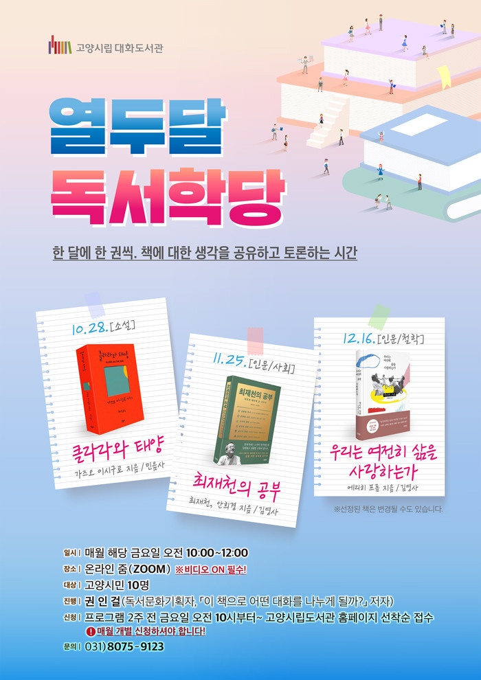 프로그램은 고양시민 10명을 대상으로 매월 해당 금요일 오전 10시부터 12시까지 2시간 동안 온라인 줌(ZOOM)으로 진행된다. 프로그램 신청은 매월 개별신청 해야 하며 매월 프로그램 시작 2주 전 금요일 오전 10시부터 고양시립도서관 홈페이지에서 신청가능하다. 기타 궁금한 사항은 대화도서관 독서문화프로그램 담당자(031-8075-9123)에게 문의하면 된다.