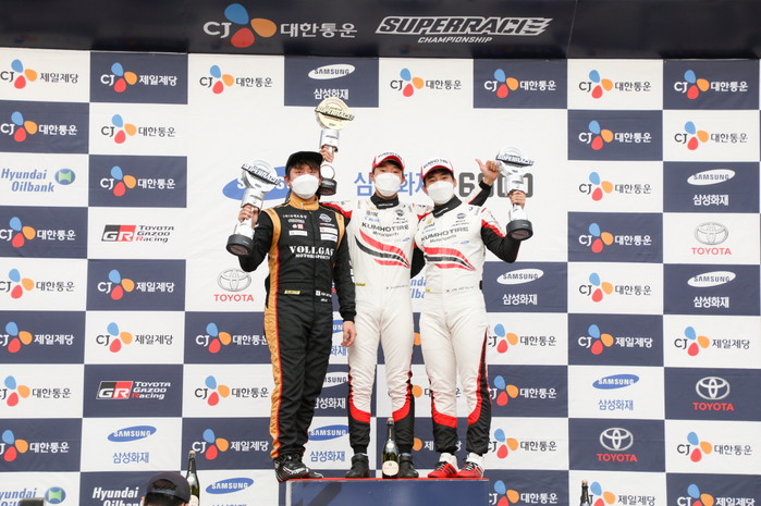 [사진설명] 2021 CJ대한통운 슈퍼레이스 챔피언십 5라운드 삼성화재 6000 클래스에서 우승한 엑스타 레이싱의 노동기(가운데)와 함께 포디움에 오른 이정우(오른쪽)가 기뻐하고 있다.