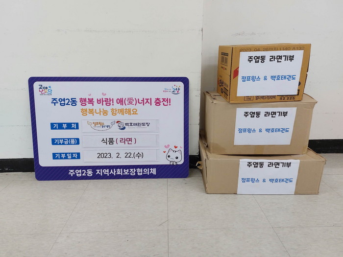 [부자동네타임즈 김인수기자] 고양특례시 주엽2동 행정복지센터는 지난 22일 관내 문촌마을에 위치한 점프윙스·백호태권도로부터 라면을 전달 받았다고 전했다.