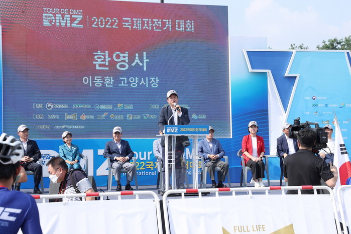 [부자동네타임즈 김인수기자] 고양특례시에서 ‘TourdeDMZ 2022’ 국제자전거대회의 개막식이 열렸다. 이동환 고양시장은 “세계사이클연맹이 공인하는 국제자전거대회의 서막이 고양시에서 열린 것을 기쁘게 생각한다. 선수 모두 사고 없이 안전한 경기를 치르기 바란다.”고 참가 선수들을 격려했다.