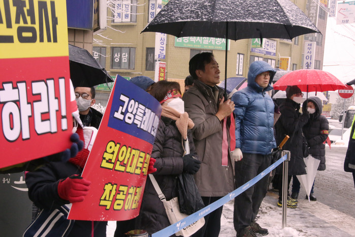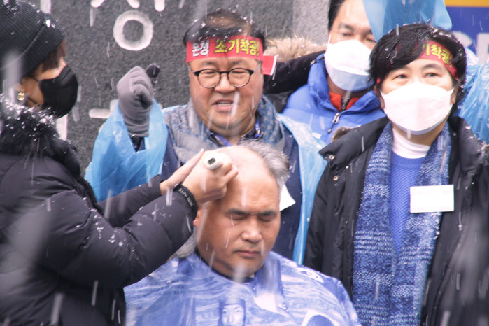 [사진설명] 문재호시의원(더불어민주당) 눈을 맞으며 삭발식을 진행하고 있다.