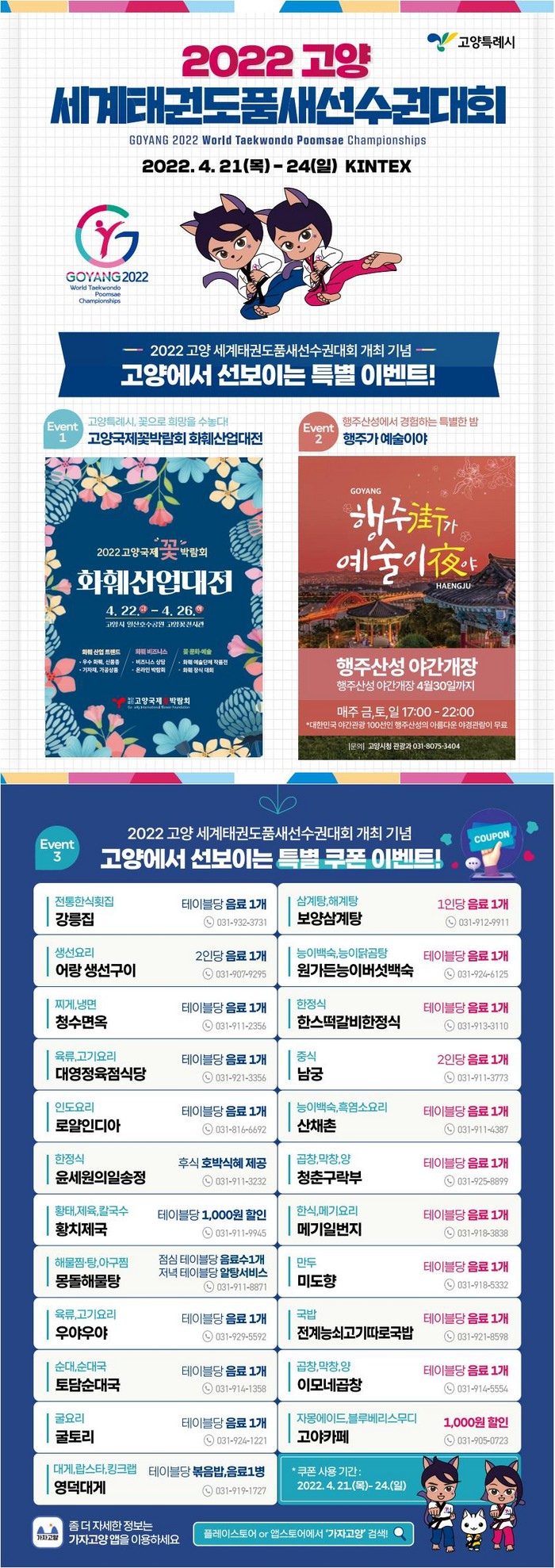 [부자동네타임즈 김인수기자] 고양시가 2022년 고양에서 열리는 세계태권도 품새 선수권대회를 성공적으로 개최하기 위하여 다양한 서비스를 선보인다. 시는 관광특구를 중심으로 23개 음식점과 카페 등이 할인 프로모션을 실시한다고 밝혔다.