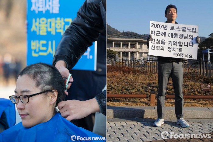 | △ 7일 오후 서울 관악구 서울대학교 정문 앞에서 사시 준비생 3명이 사법고시 존치를 요구하며 삭발식(왼쪽)을 진행했다. 반면 같은 날 서울대로스쿨 학생들은 청와대‧국회‧법무부 등지에서 '사시 2017년 폐지'를 주장하며 정부의 사시 존치 입장 발표에 항의하는 1인시위에 돌입했다.<사진제공=포커스뉴스> |