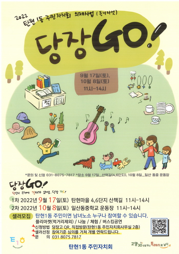 탄현1동 2022년 마을 의제사업 ’당장 GO(플리마켓)’는 안 쓰는 물건이나 재활용이 가능한 물건을 나눠 쓰거나 판매하여 생활 속 쓰레기를 줄여 탄소중립실천에 조금이나마 기여하고자 한다. 이날 플리마켓에서는 나눔 판매뿐만 아니라 체험활동 및 버스킹 공연 등이 진행될 예정이다. 참여를 원하시는 주민은 탄현1동 주민자치회에 전화(031-8075-7817)로 신청하고 참여하면 된다.