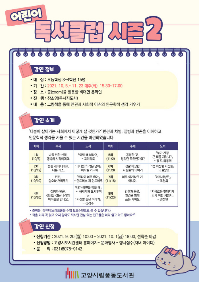 [부자동네타임즈 김인수기자] 고양시 풍동도서관이 오는 10월 5일부터 11월 23일(화)까지 초등학교 3~4학년을 대상으로 그림책 인문학 수업 ‘어린이 독서클럽 시즌2’를 진행한다.