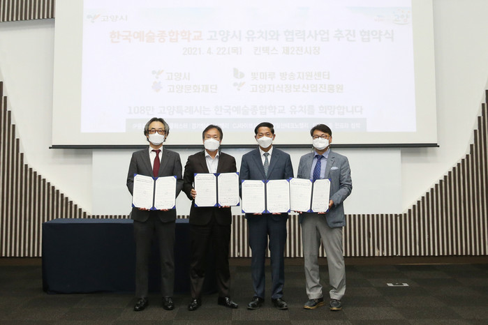 [사진설명] ‘고양시-빛마루방송지원센터-고양문화재단-고양지식정보산업진흥원’ 한예종 유치 위한 협약 체결.