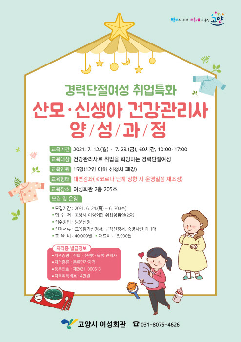 [부자동네타임즈 김인수기자] 고양시 여성회관이 오는 7월 12일부터 경력단절여성을 대상으로 ‘산모·신생아 건강관리사 양성과정'을 운영한다.