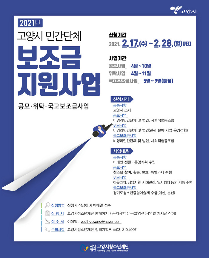 보조금 지원사업은 총 2억 360만 원의 예산을 투입하여 총 26개 사업자가 선정될 예정으로, 보조금 지원사업의 세부 공모 분야와 공고 내용은 고양시청소년재단 홈페이지 공지사항에서 확인할 수 있다.