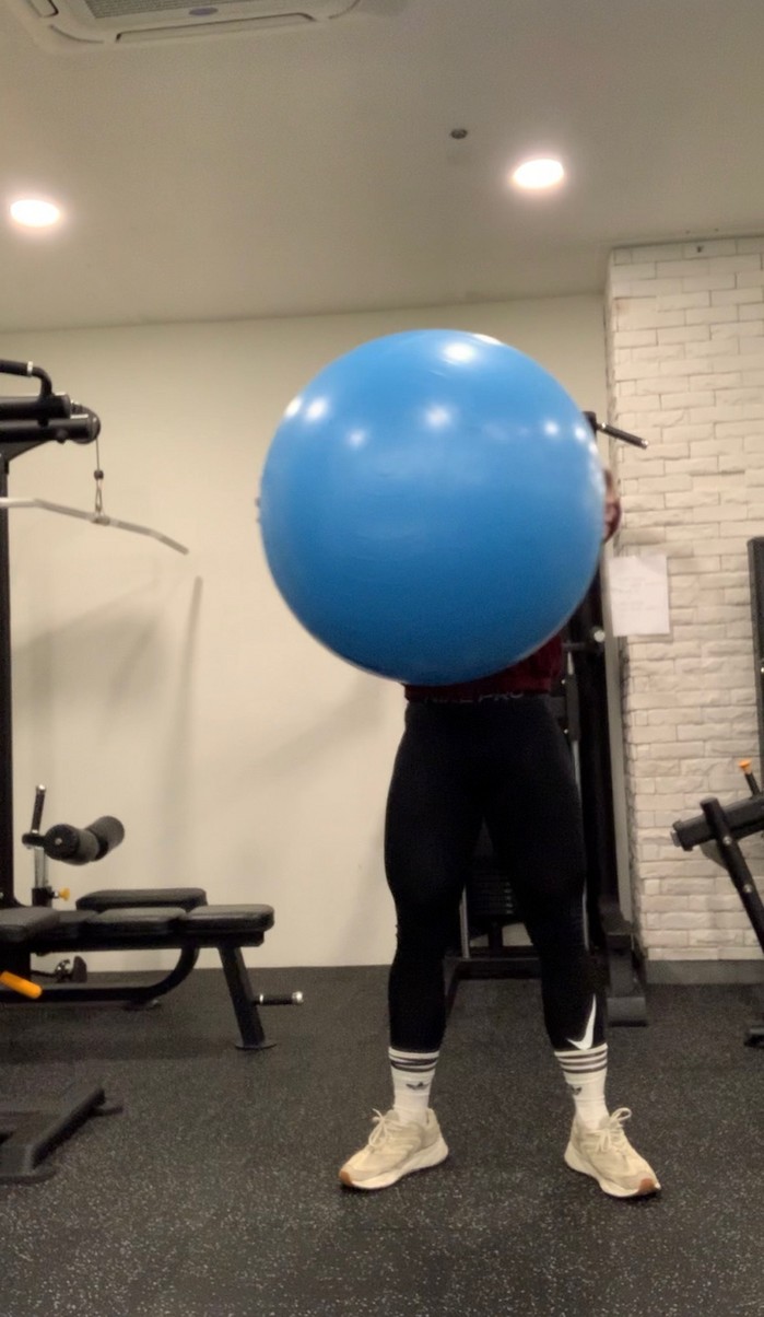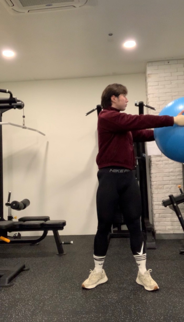 1.짐볼을 들고 앞으로 나란히 한다.