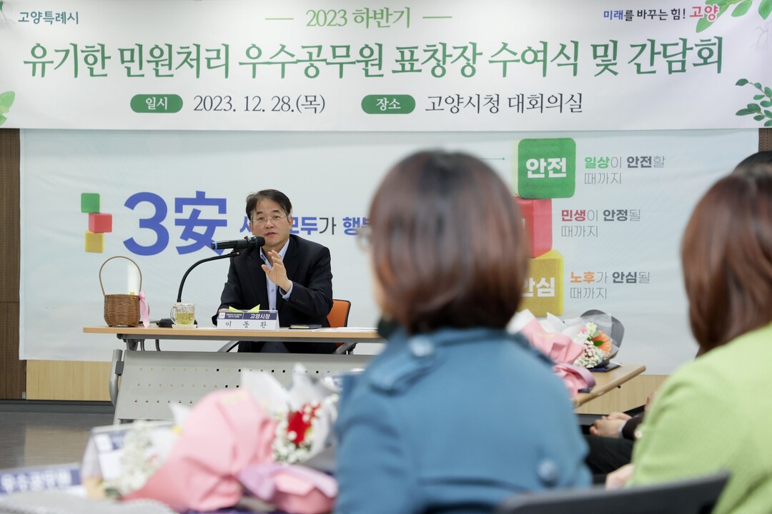 2023년 하반기 민원처리 우수공무원은 단순민원 우수자 부문에 ▲버스정책과 김성조 주무관 ▲주택과 김도훈 주무관 ▲주차교통과 남상선 주무관 ▲생태하천과 임미조 주무관 ▲일산동구보건소 보건행정과 이기환 주무관 ▲일산서구보건소 보건행정과 황보경 주무관 ▲덕양구 산업위생과 고광윤 주무관 ▲일산동구 환경녹지과 조희주 주무관 ▲일산서구 산업위생과 박지윤 주무관 ▲백석1동 정수진 주무관 ▲흥도동 신상애 주무관 ▲고양동 이선우 주무관이 선정됐다.