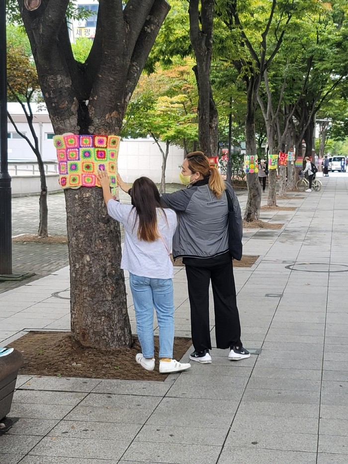 이번 행사를 위해 60명의 자원봉사자는 8월부터 10월까지 100여 그루의 나무에 거치할 알록달록 수세미 3.000여 개를 직접 손뜨개 했다.