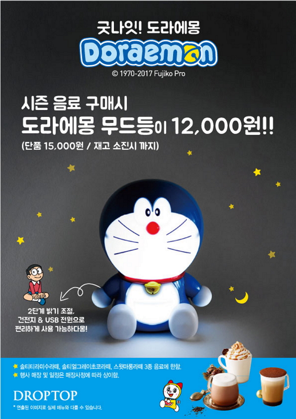 커피전문점 카페 드롭탑은 지난 1일부터 겨울시즌 음료 출시 기념으로 전국 매장에서 도라에몽 무드등을 판매 중이다. 도라에몽 무드등은 높이 18cm의 미니멀한 사이즈로 휴대가 용이하며, 2단계 밝기 조절과 건전지 혹은 USB전원으로 디자인은 물론 실용성과 편리성까지 잡은 제품이다. 최근에 출시한 겨울시즌 음료 ‘스윗 마롱 라떼’, ‘솔티 얼그레이 초코라떼’, ‘솔티 티라미수 라떼’를 구매하면 도라에몽 무드등을 1만 2천원에 구매할 수 있고, 단품으로는 1만 5천원에 판매한다. 이벤트는 재고 소진 시까지 진행되며, 행사 매장 및 일정은 일부 상이할 수 있다.