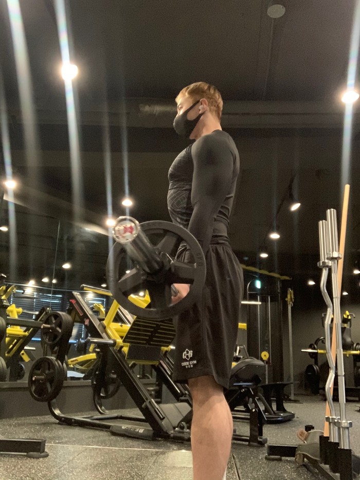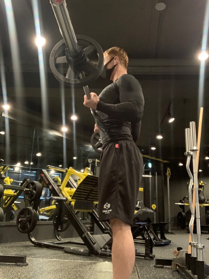 2,바벨를 들어 올리면서 약간 뒤로 당긴다는 느낌으로 수축 시킨다.