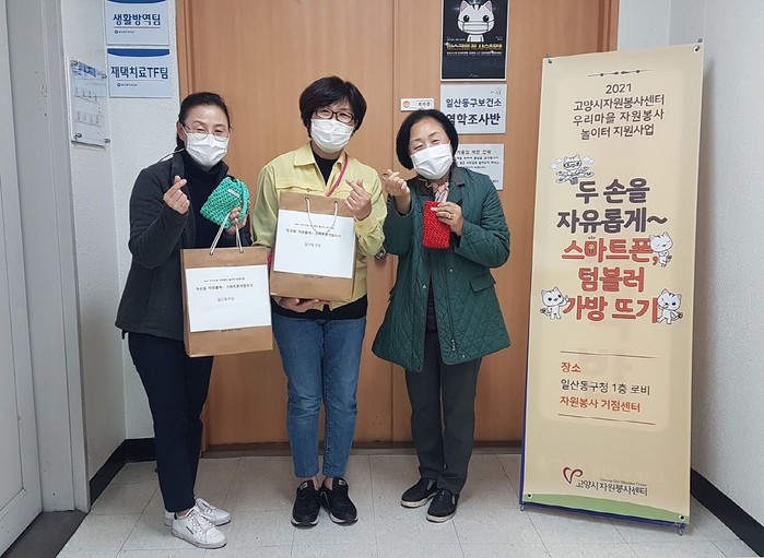 [부자동네타임즈 김인수기자] 고양시자원봉사센터(이하 센터)는 지난 29일, 일산동구청 거점센터에서 올해 추진한 우리마을 자원봉사 놀이터 지원사업『두 손을 자유롭게~ 스마트폰·텀블러 가방 뜨기』의 완성품 90여개를 일산동구 보건소에 전달했다.