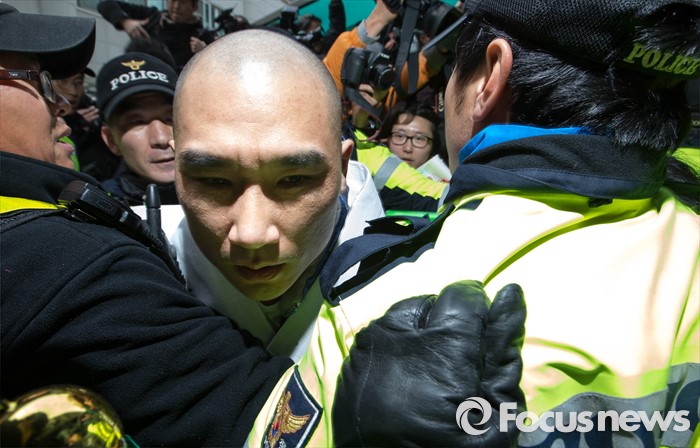 | △ 경찰이 한상균 민주노총 위원장을 체포하겠다고 통보한 9일 오후 서울 종로구 조계사에서 경찰병력이 관음전 건물로 진입을 시도하는 과정에서 경찰병력 진입을 반대하며 저항하는 한 스님이 경찰 병력에 끌려 나가고 있다. <사진제공=포커스뉴스> |
