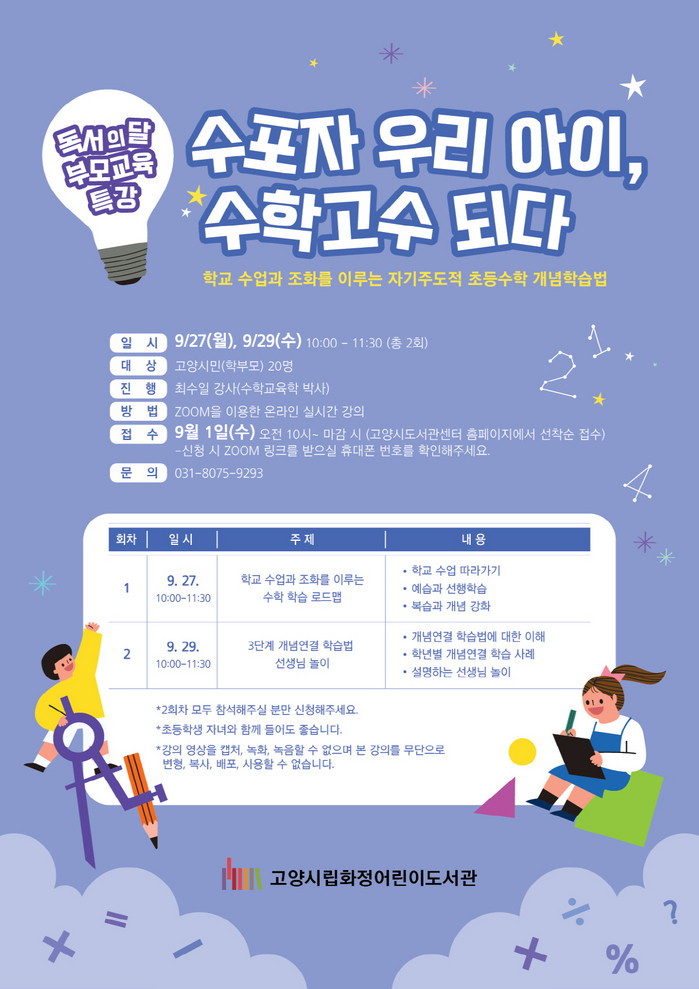 [부자동네타임즈 김인수기자] 고양시 화정어린이도서관이 독서의 달을 맞이하여 자녀 수학 교육에 관심이 있는 부모들을 대상으로 수포자 우리 아이, 수학고수 되다를 운영한다.