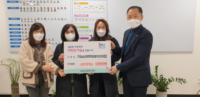 [부자동네타임즈 김인수기자] 고양시 덕양구 삼송1동 행정복지센터(동장 김동원)는 지난 19일, 삼송동 소재 하늘숲에벤에셀 어린이집(원장 윤경순)에서 150여 명의 원생들과 직원들이 모아온 사랑의 후원금 123만 3천원을 삼송1동 행정복지센터에 기부했다고 밝혔다.