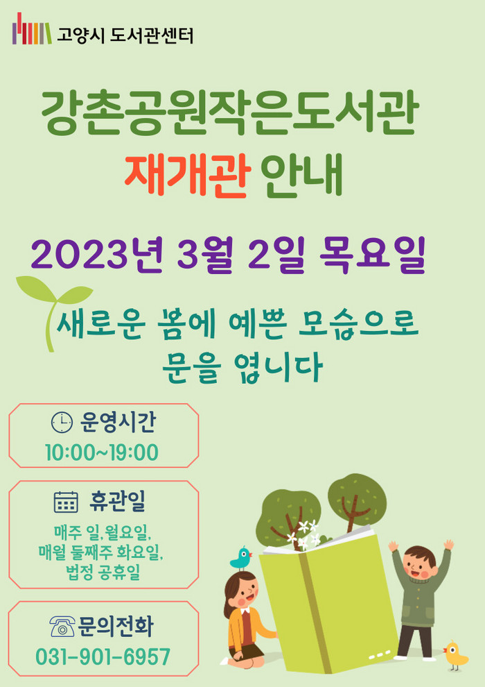 [부자동네타임즈 김인수기자] 고양특례시(시장 이동환) 강촌공원의 작은도서관이 개선 공사를 마치고 오는 3월 2일 재개관한다.