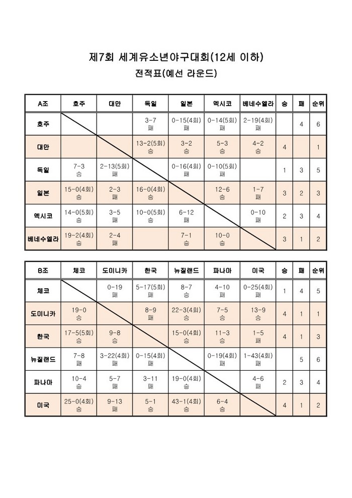 [부자동네타임즈 김인수기자] 제7회 세계유소년야구대회(12세 이하)[대만, 타이난]에 참가하고 있는 유소년 야구 국가대표팀이 예선라운드 마지막 경기에서 뉴질랜드에 15-0, 4회 콜드게임 승을 거뒀다.
