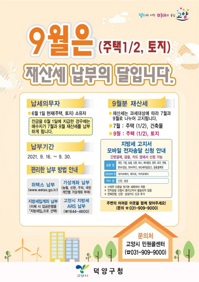 [부자동네타임즈 김인수기자] 고양시 덕양구(구청장 명재성)가 2021년 9월 재산세를 부과하고 9월 9일 고지서를 발송했다.