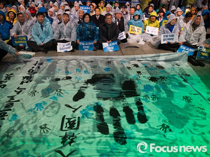 (서울=포커스뉴스) 6일 오후 서울 종로구 보신각 앞에서 열린 새정치민주연합 역사 교과서 국정화저지 문화제에서 문재인 대표와 의원들이 고시 철회를 촉구하는 피켓을 들고 있다.