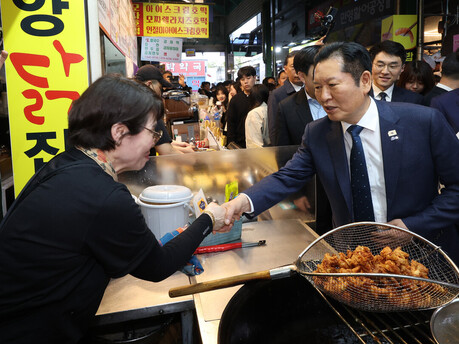 [부자동네타임즈 = 조영재 기자] 더불어민주당 정청래 대표가 11일 강원 강릉시 중앙시장을 방문해 상인들과 인사하고 있다. 2026.4.11