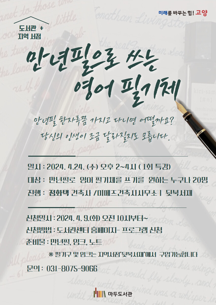 첫 순서로 문구 및 필기구 특화 지역서점인‘뒷북서재’와 함께 오는 4월 24일 수요일 오후 2시에 <만년필로 쓰는 영어 필기체>를 진행한다.
