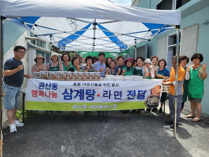 이날 나눔 행사에는 관산동 새마을부녀회 회원 등 20여 명이 참여해 이른 아침부터 삼계탕을 직접 만들어 포장했다. 직접 만든 삼계탕과 라면을 취약계층 어르신들에게 전달하며 건강과 안부를 살폈다.