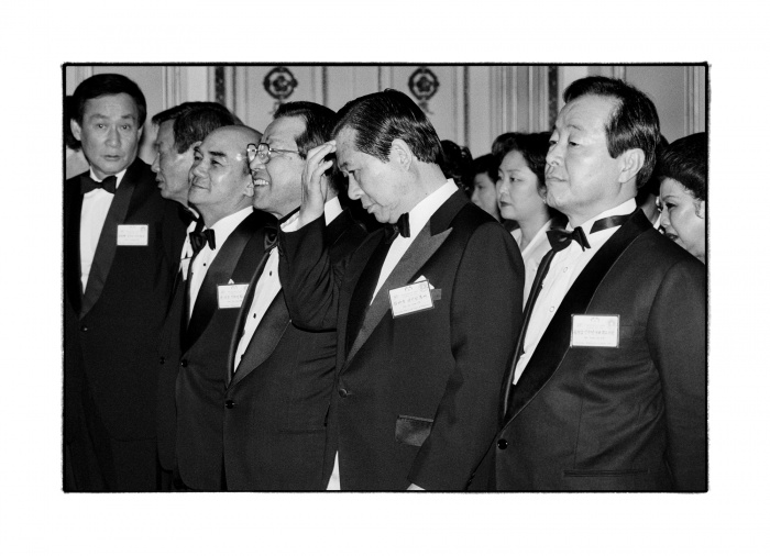 | △90년 3당합당 후,한 행사장에 참석한 민자당 대표최고위원 시절의 김영삼 전 대통령 (오른쪽 끝)이 당시 김대중 평민당 총재와 김종필, 박태준 민자당 최고위원 등. <사진제공=최재영 사진가> |
