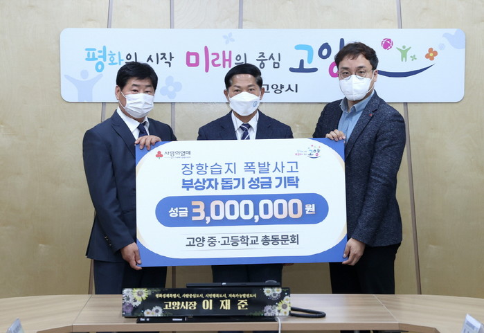 [부자동네타임즈 김인수기자] 고양시가 고양 중‧고등학교 총동문회(회장 이완주) 회원들이 지난 10일 고양시청을 방문해 장항습지 지뢰폭발사고 부상자를 위한 성금 300백만원을 전달했다고 밝혔다.