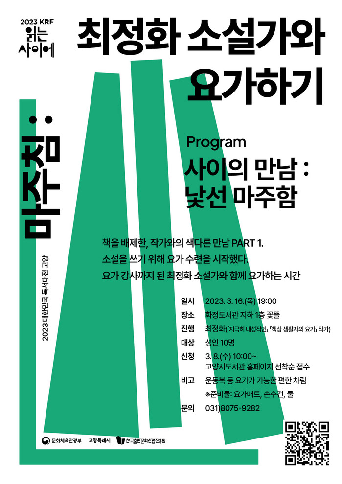 [부자동네타임즈 김인수기자] 고양특례시(시장 이동환)가 2023 대한민국 독서대전을 유치해 다양한 책의 도시 연중 프로그램을 펼치고 있는 가운데, 3월 16일(목) 저녁 7시 화정도서관 꽃뜰에서 ‘최정화 소설가와 요가하기’ 프로그램을 추진해 시선을 사로잡고 있다.