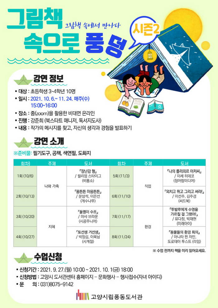 [부자동네타임즈 김인수기자] 고양시 풍동도서관이 오는 10월 6일(수)부터 11월 24일(목)까지 총 8회(매주 목요일 15:00~16:00)에 걸쳐 초등학교 3~4학년 대상으로 온라인 인문학 프로그램을 진행한다.