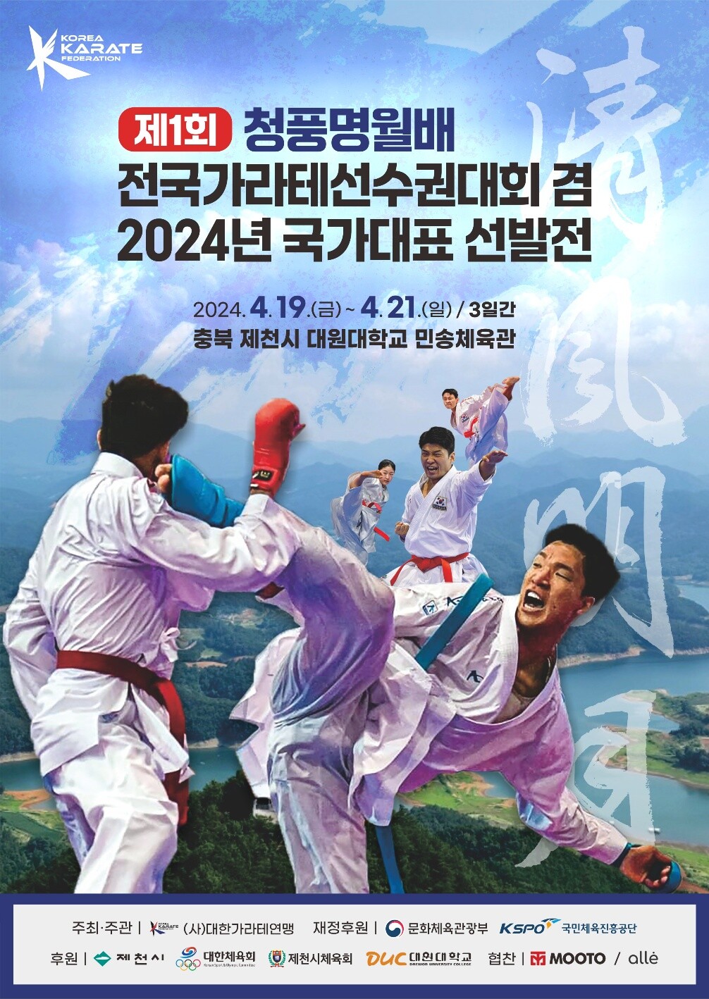 [부자동네타임즈 = 김인수 기자] 대한가라테연맹(강민주 회장)은 대한가라테연맹이 주최·주관하는 제1회 청풍명월배 전국가라테선수권대회 겸 2024년 국가대표 선발전을 4월 19일부터 4월 21일까지 충북 대원대학교에서 개최한다고 밝혔다.