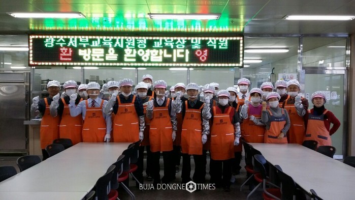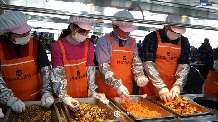 이날 김 교육장과 직원들은 빛고을노인건강타운 어르신 1000여 명에게 4시간 동안 급식을 배식하며 현장 종사자들의 노고를 체험했다. 식사 후에는 식당 청소, 식기 소독, 잔반정리 등으로 구슬땀을 흘렸다.