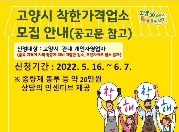 [부자동네타임즈 김인수기자] 고양시는 ‘고양시 착한가격업소’를 활성화하고 지역 물가안정에 기여하기 위해 공개 모집을 진행하고 있다. 시는 공개모집을 6월 7일까지 진행한다고 밝혔다.