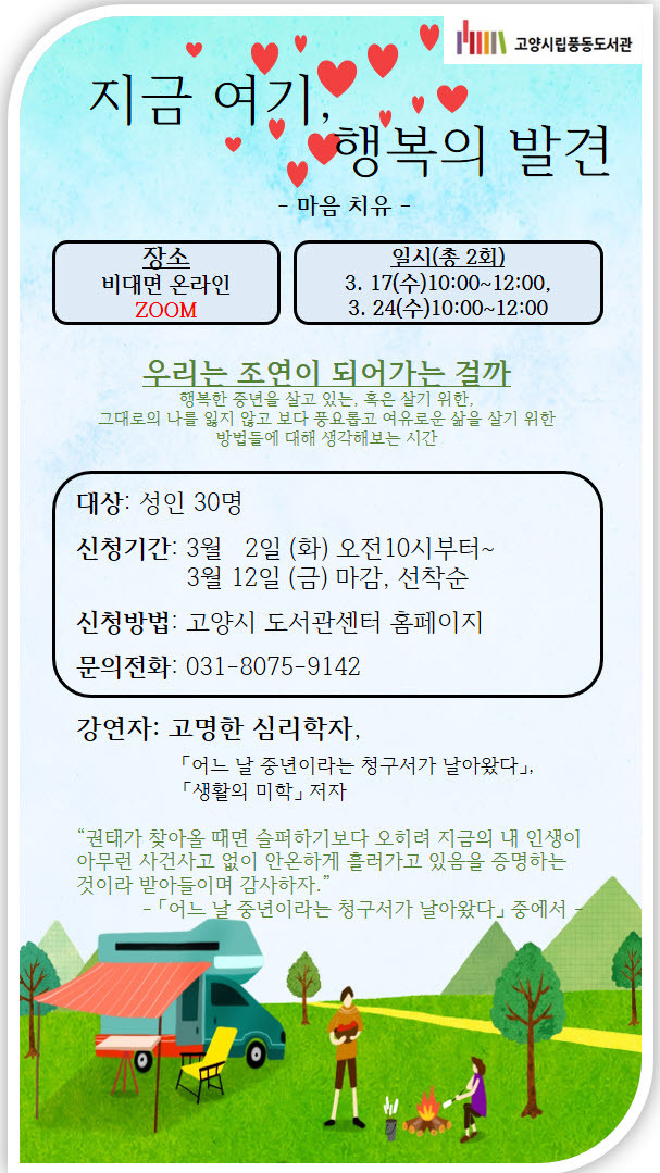 신청은 3월 2일(화) 오전 10시부터 고양시도서관센터 홈페이지에서 접수하면 된다. 모집 인원은 예비 중년 및 중년 등 성인 30명이고, 선착순 마감이다.