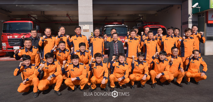 △윤장현 광주시장은 설 연휴 첫째 날인 광산소방서와 망월묘지공원, 영락공원을 찾아 근무 중인 직원들을 격려하고 시민 안전과 편의에 최선을 다해줄 것을 당부히거 기념촬영을 했다 |