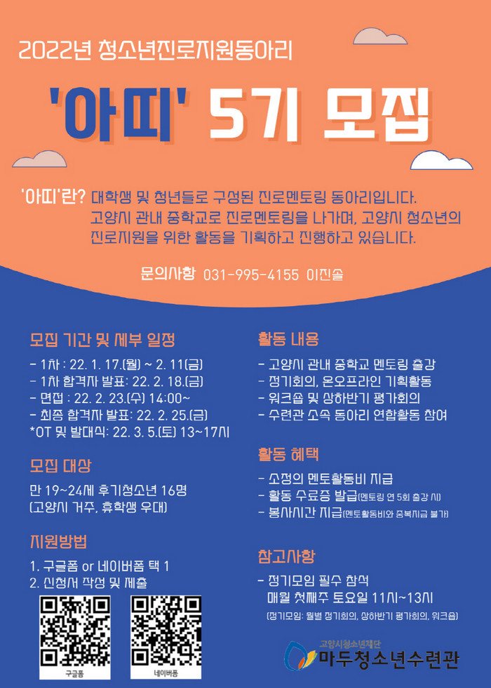이번 멘토 모집에 관심 있는 만 19~24세 대학생 및 청년은 누구나 2월 11일까지 지원할 수 있으며, 자세한 내용과 문의는 마두청소년수련관 홈페이지 공지사항로 문의하면 된다.