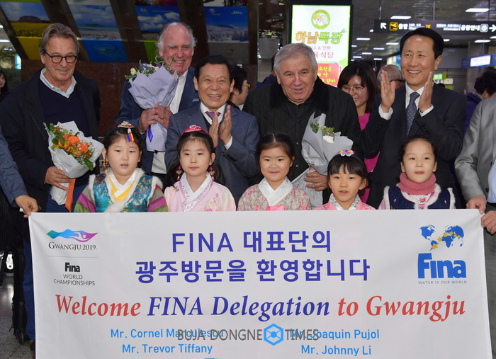 | △ 윤장현 광주광역시장이 15일 오후 광주공항에서 '2019 광주세계수영선구권대회' 경기장 점검을 위해 국제수영연맹(FINA) 대표단과 기념촬영을 하고 있다 |