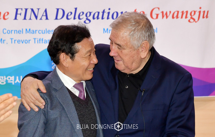 | △윤장현 광주광역시장이 '2019 광주세계수영선구권대회' 경기장 점검을 위해 국제수영연맹(FINA) 대표단과 함께 광주를 찾은 코넬 마르쿨레수쿠 FINA 사무총장과 만나 인사를 나누고 있다 |