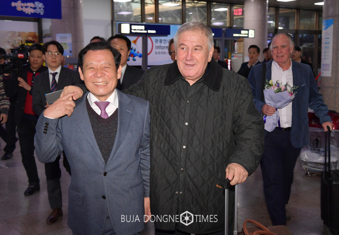 윤장현 광주광역시장이 오후 광주공항에서 '2019 광주세계수영선구권대회' 경기장 점검을 위해 국제수영연맹(FINA) 대표단과 함께 광주를 찾은 코넬 마르쿨레수쿠 FINA 사무총장과 만나 인사를 나누었다.