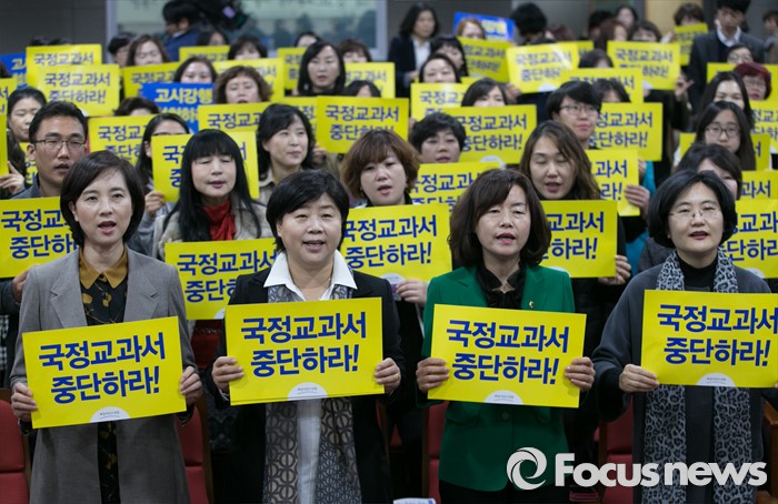(서울=포커스뉴스) 20일 오전 서울 여의도 국회 의원회관에서 열린 역사교과서 국정화 저지 위한 학부모 간담회에 참석한 서영교 새정치민주연합 전국여성위원장 등 참석자들이 국정교과서 중단 촉구 구호를 외치고 있다.