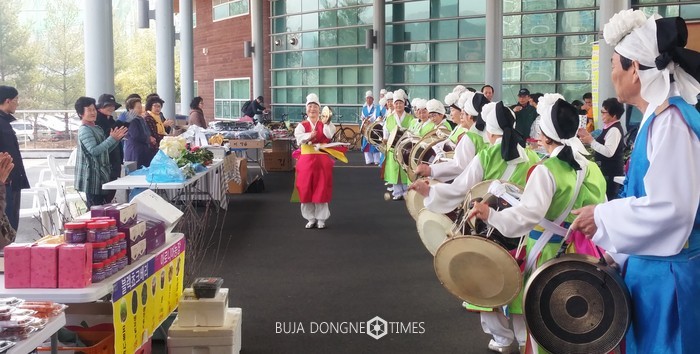 | △광주 지역 농업인과 소비자가 직접 만나는 로컬푸드 직거래 장터가 빛고을노인건강타운 야외 광장에서 열려 축하행사를 열고 있다 |