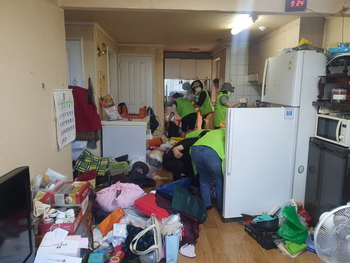 이번에 대상이 된 어르신 집은 오랜 기간 주변에 있는 폐기물·재활용품·옷 등을 가져다 쌓아 놓아 발 디딜 틈이 없고, 악취와 바퀴벌레로 건강에 매우 취약한 환경이라 이웃주민에까지 피해를 주고 있어 긴급한 개입이 필요한 상태였다.