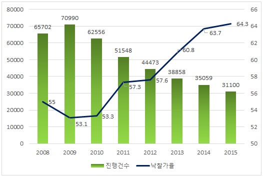 낙찰가율 역시 지난 2001년 이후 최고 수준이며 2009년 53.1%를 기록한 이래 매년 점진적으로 상승세를 나타내고 있는 추세다.