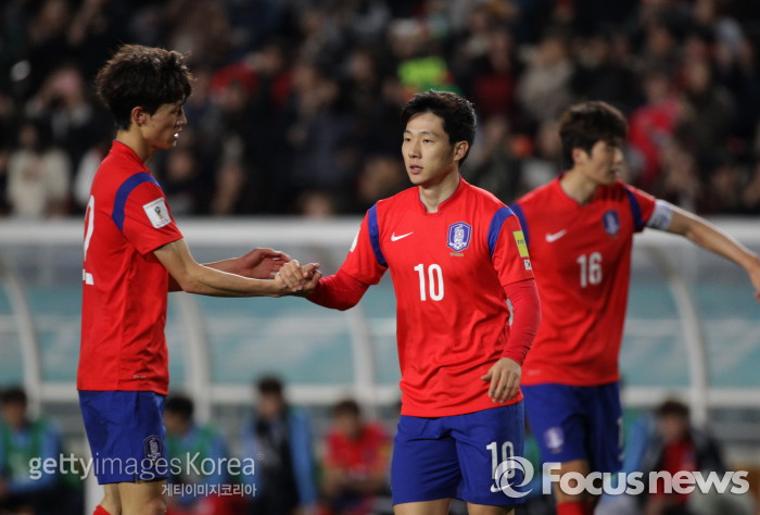 | △ <수원/한국=게티/포커스뉴스> 한국대표팀 남태희(10번)가 11월12일 오후 경기 수원월드컵경기장에서 열린 미얀마와의 2018 라시아월드컵 아시아지역 2차예선에서 팀의 4번째 골을 터트린 뒤 동료들과 기쁨을 나누고 있다. (C)게티이미지/멀티비츠 |