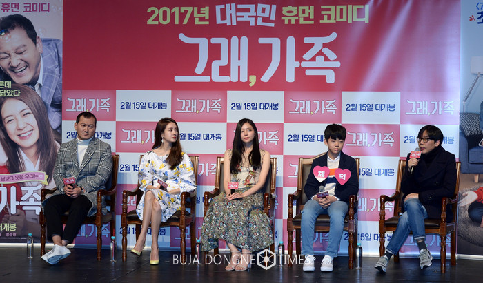 25일 오전 서울 강남구 CGV 압구정점에서 열린 영화 '그래, 가족' 제작보고회에서 마대윤(오른쪽부터) 감독, 배우 정준원, 배우 이솜, 배우 이요원, 배우 정만식이 간담회를 하고 있다. 2017.01.25.