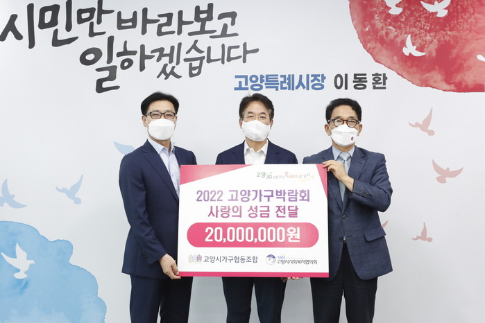 이번에 기탁된 성금 2천만원은 고양시가구협동조합에서 2022 고양가구박람회 참가업체들의 자체부담금 일부를 모아서 마련한 것으로 고양시사회복지협의회를 통해 관내 취약계층에게 전달할 예정이다.