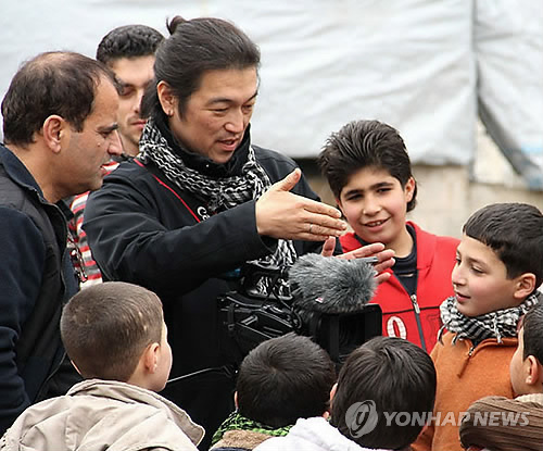 | △ (도쿄 교도=연합뉴스.자료사진) 수니파 원리주의 무장단체 '이슬람국가'(IS)로 추정되는 세력에게 살해된 프리랜서 언론인 고토 겐지(後藤健二·47) 씨(사진 속 손 내밀고 있는 사람)가 생전 시리아 북부의 알레포에서 취재하는 모습. 2015.1.23 <<인디펜던트 프레스 제공>> sewonlee@yna.co.kr |
